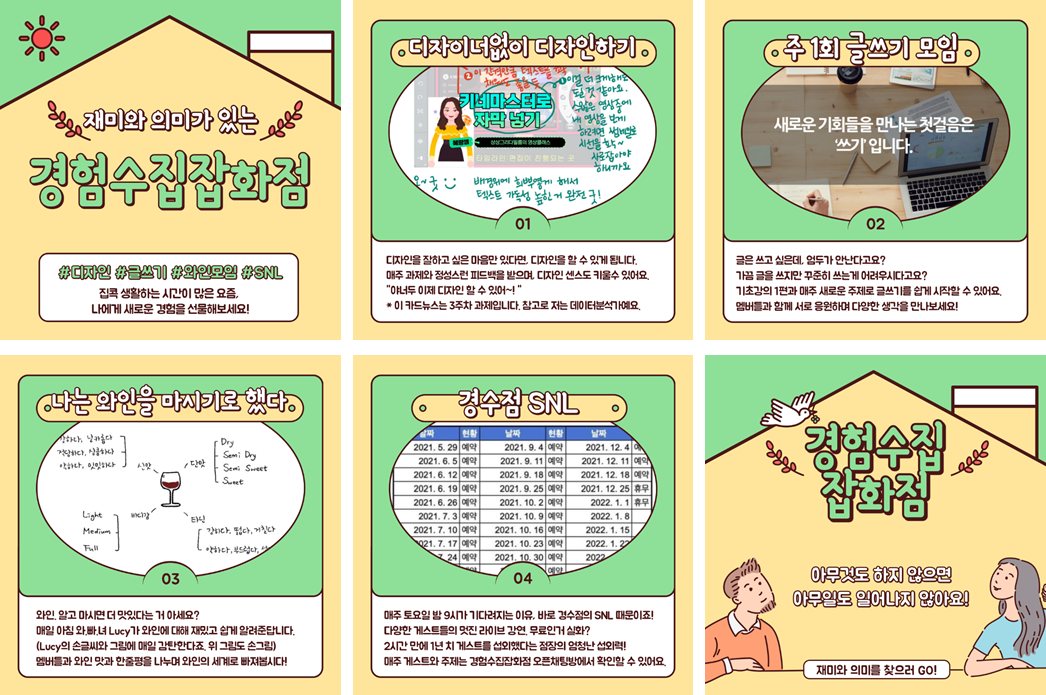 그리고 동일한 포맷으로 '경험수집잡화점'으로도 카드뉴스를 만들어봤다. 미리캔버스는 이렇게 동일한 포맷이라도 다른 내용을 담을 수 있다는 것이 신기하다.